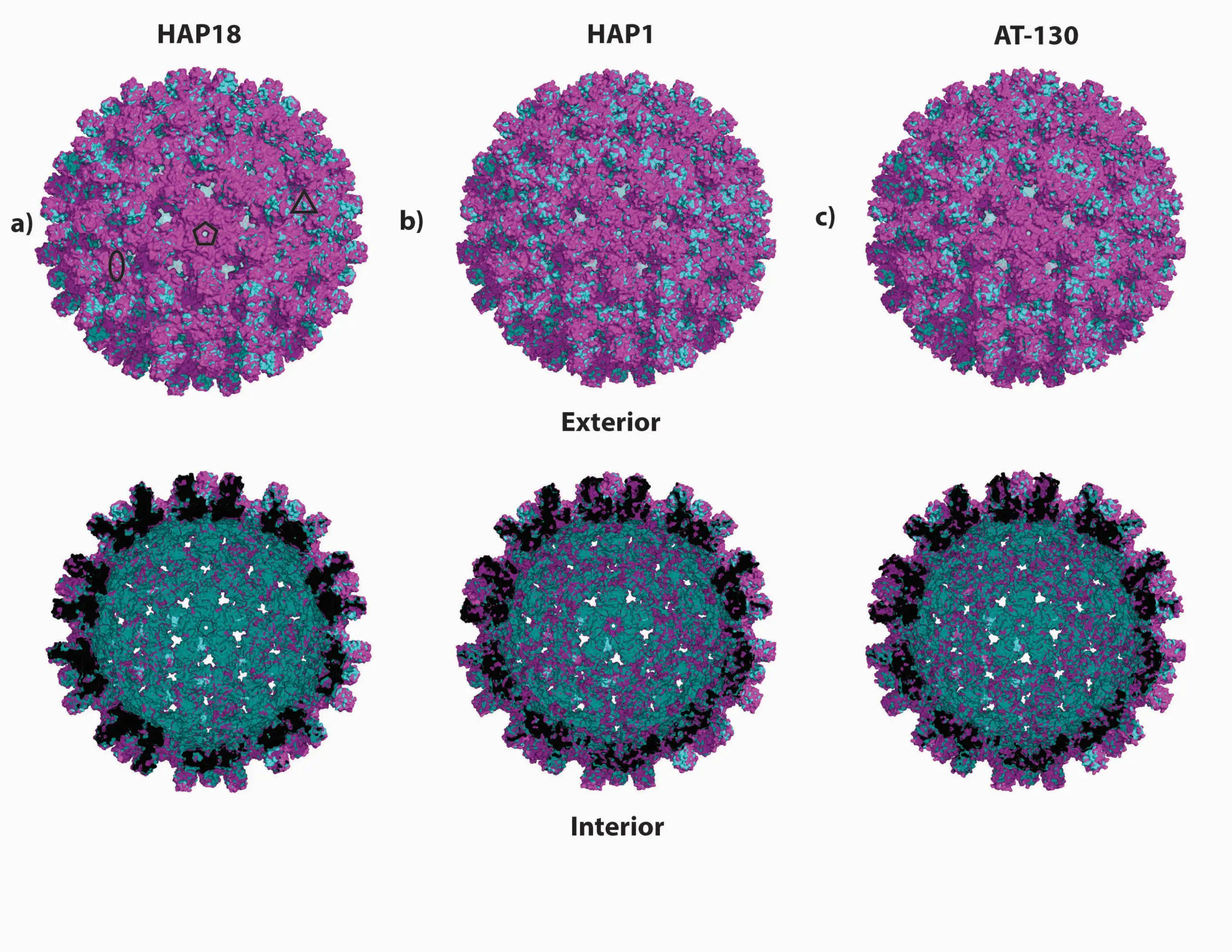 These overlays show comparisons of Hepatitis B Virus capsids with bound drugs (purple) to a normal capsid without drug (green). Though the drugs, HAP1, HAP18, and AT130, each bind to different sites, their effects on capsid structure are distinctly different.